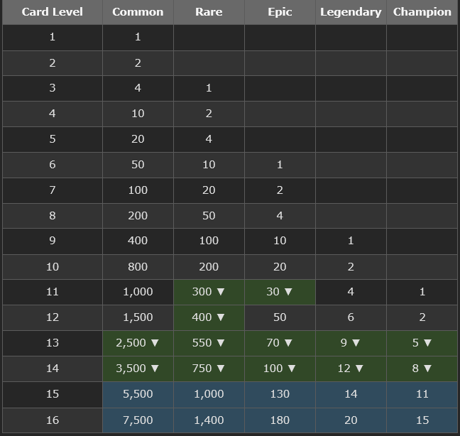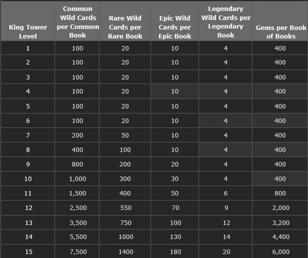 Wartości konwersji będą zależeć od Poziomu Waszej Wieży Króla (King Tower Level) i będą odpowiadać nowym, obniżonym kosztom ulepszeń. Na przykład, jeśli macie 10. Poziom Wieży Króla, otrzymacie wystarczająco dużo Dzikich Kart, aby w pełni ulepszyć kartę z poziomu 10 na 11.